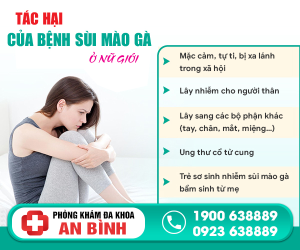 -Ảnh hưởng đến khả năng sinh sản: Sùi mào gà ở nữ rất dễ có thể làm tăng nguy cơ vô sinh hiếm muộn, các bệnh về âm đạo, tử cung. Nguyên nhân là do virus này phá hủy các mô cơ, gây viêm nhiễm và tắc nghẽn đường sinh sản của nữ giới.
