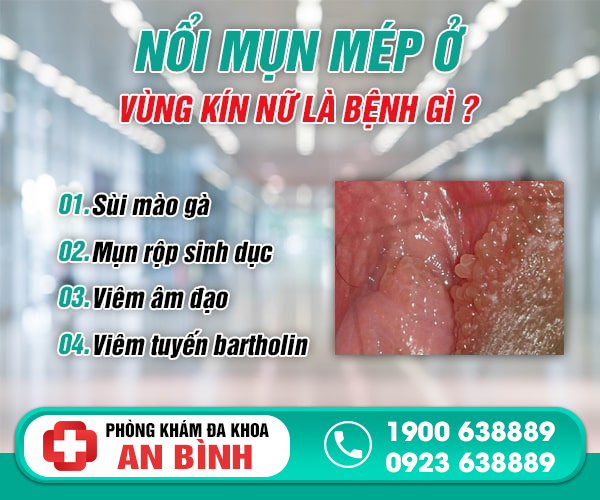 Nổi mụn ở mép vùng kín có thể do bệnh sùi mào gà gây ra. Cụ thể ở mép vùng kín, môi lớn, môi bé xuất hiện mụn sùi, u nhú có màu hồng nhạt hoặc màu da.